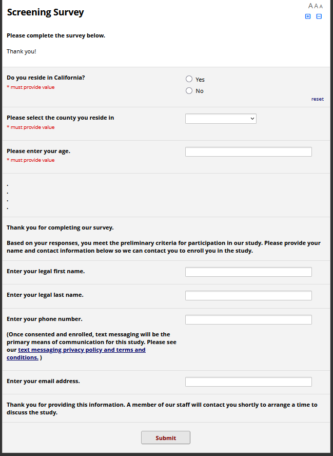 Participants are recruited via social media advertisements that redirect them to a screening survey that automatically assesses whether they are eligible to join the study. (Please note that this link shows and abbreviated version of the survey so that the opt-in process can be easily shown.)